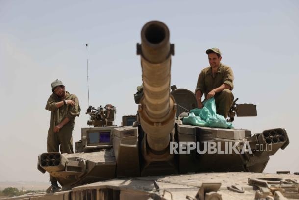 Tentara Israel di dalam tank saat mereka berkumpul di lokasi yang dirahasiakan dekat pagar perbatasan dengan Jalur Gaza, di Israel selatan, 21 Mei 2024. – (EPA-EFE/ABIR SULTAN)